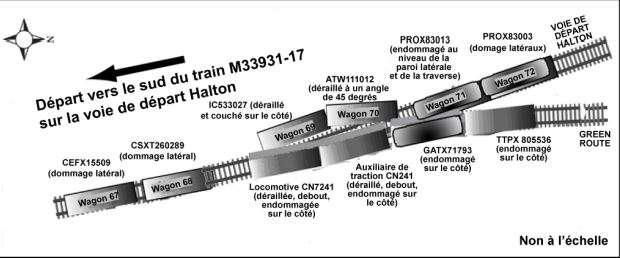 La locomotive (CN7241), l'auxiliaire de traction (CN241) et les deux wagons de tête suivants ont déraillé et sont demeurés debout. Les wagons qui ont déraillé incluent un wagon-citerne chargé de mazout brut (GATX71793, non placardé) et un wagon à cloisons chargé de tôles d'acier (TTPX805536). Tous les wagons qui ont déraillé ont subi des dommages considérables au niveau de la caisse, des bogies et des accouplements du côté où ils sont entrés en contact avec le train 339. Le bogie avant de la locomotive CN7241 s'est arrêté sur un passage à niveau en madriers de bois au sud de l'aiguillage, environ 50 m (165 pi) au delà du point de dégagement de la voie de départ Halton (voir photo 1). Le rail est s'est renversé et le réservoir de carburant de la locomotive CN7241 a été percé. L'aiguillage et environ 200 pieds de voie ont été endommagés ou détruits