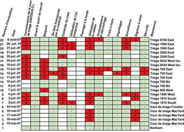 On évalue les connaissances des stagiaires; ceux-ci doivent réussir l'évaluation afin de pouvoir poursuivre leur formation. À un moment donné, un des sujets du cours était l'orientation des gares de triage; ce sujet comprenait un test sur les cours de triage. En 2007, il n'y avait plus de test sur les cours de triage dans le plan de cours. De plus, à la fin des années 90, le manuel sur les cours de triage et le matériel de cours comprenaient des cartes de la cour de triage MacMillan; ce matériel n'était pas inclus dans le cours de 2007 ni dans la mise à jour du manuel sur les cours de triage. - Formation de 2 semaines sur le système Beltpack
