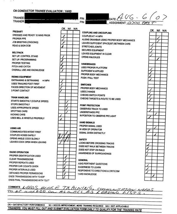 L'assistant de la manœuvre de triage 2200 West s'est qualifié à titre de chef de train le 14 août 2007 après avoir terminé 34 voyages de formation et réussi un examen de qualification. L'examen de deux heures, tenu lors d'un quart de travail de jour à West Control, consistait en ce qui suit :