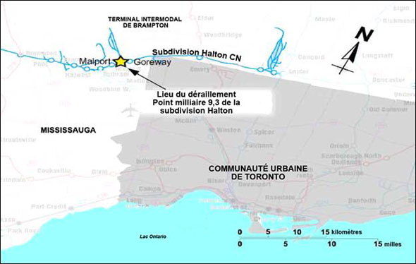 D'ouest en est, la subdivision Halton va du point milliaire 49,5, à la jonction avec la subdivision Oakville à Burlington (Ontario), jusqu'au point milliaire 0,0, où elle rejoint la subdivision York à Toronto. Dans le secteur où le déraillement s'est produit, la voie principale de la subdivision Halton est double, et la vitesse maximale autorisée est de 50 mi/h pour les trains de marchandises et les trains de voyageurs. Lors du déraillement, aucune limitation de vitesse n'était en vigueur dans le secteur.