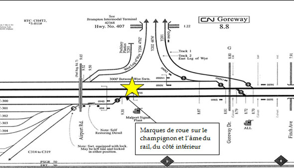 Les wagons déraillés étaient étalés d'est en ouest le long du tronçon nord de la voie principale, entre le passage à niveau de Goreway Drive et la structure de signalisation du point milliaire 9,3. Les wagons déraillés n'ont pas obstrué le tronçon sud de la voie principale.
