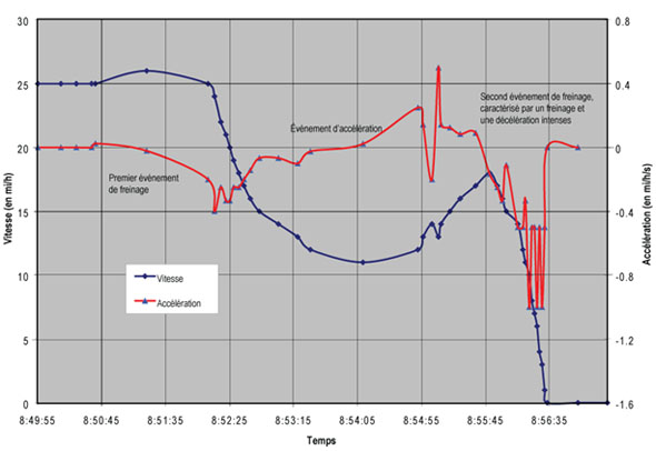 - Tout juste avant le déraillement, le train a connu deux événements de freinage (décélération) et un événement d'accélération.