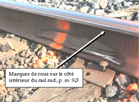 L'examen du rail a révélé la présence de nombreuses marques laissées par des boudins de roues sur le côté intérieur du rail nord et du rail sud. Certains essieux montés chevauchaient le rail sud, à l'est de l'endroit où le rail s'était rompu dans des soudures aluminothermiques. Les dommages causés aux traverses, aux anticheminants et aux crampons se trouvaient surtout du côté intérieur des deux rails. On a retracé les marques de roues et déterminé que leur point d'origine se trouvait aux environs du point milliaire 9,3, où il y avait des marques sur le champignon et sur le côté intérieur du rail sud (voir la photo 1). À environ 20 pieds à l'est, on a relevé des marques similaires sur le rail nord. Près de ces marques de roues, les crampons du côté intérieur étaient soulevés, ce qui dénote un éventuel renversement du rail.