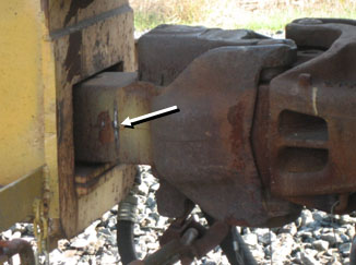 Plusieurs des wagons déraillés portaient des marques d'impact récentes au centre de l'ouverture d'attelage de la traverse extrême du wagon, et sur la saillie d'arrêt de la tête d'attelage. Après avoir examiné un groupe de 10 wagons basculants pneumatiques, on a constaté que sept de ces wagonsNote de bas de page 4 montraient des rainures profondes sur les côtés de leurs bras d'attelage et des marques d'impact sur le côté des ouvertures de la traverse extrême (voir les photos 2a et 2b). Les rainures en question étaient particulièrement évidentes entre les wagons nos BGSX 122226 (le 23e wagon) et BGSX 122227 (le 24e wagon). De plus, la table de roulement des roues de ces deux wagons montrait des signes de martèlement et des rayures.