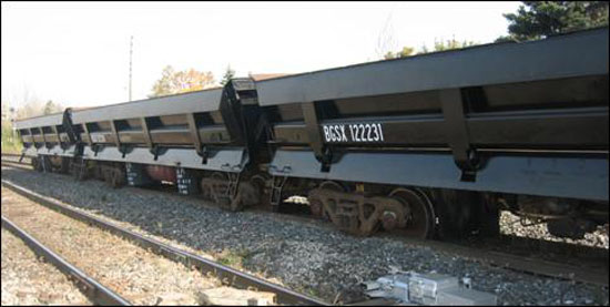 Les wagons basculants pneumatiques (de la série BGSX) qui ont été mêlés au déraillement ont été conçus et fabriqués en vue d'une utilisation dans l'industrie minière. Ces wagons sont conçus pour rouler sur des voies dont la courbure est accentuée et sur des voies construites sur un sol peu tassé (par exemple une voie temporaire). Pour réduire au minimum le risque de déraillement, on avait équipé les wagons d'attelages à garde inférieure de type E, approuvés par l'Association of American Railroads (AAR). Ces attelages étaient munis d'un about pivotant renforcé pour locomotive et axe d'un plein de pivotement vertical. Les attelages étaient conçus pour atteindre une valeur maximale de pivotement de 13 degrés de part et d'autre de l'axe longitudinal.