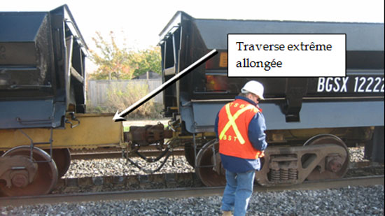 - Le 8 juillet 2002, déraillement de 2 locomotives et des 27 premiers châssis de wagons du train de marchandises no A44251-08. Pendant un freinage, les attelages sans dispositif de centrage dont les locomotives déraillées étaient équipées ont fait en sorte que les angles des attelages atteignent une valeur maximale d'environ 19 degrés. Les forces de compression qui se sont transmises par ces attelages ont généré des efforts latéraux suffisants pour causer le renversement du rail et un soulèvement des roues, qui ont entraîné le déraillement (rapport no R02C0050 du BST).