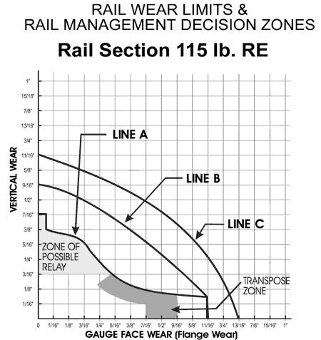 Selon les normes du Chemin de fer Canadien Pacifique, le rail peut être considéré comme avoir atteint sa limite de fatigue lorsque, dans une courbe, le rail excède les limites d'usure montrées par la « Line A » (ligne A) de la figure ci-dessous, qu'il a le même type et le même âge, et qu'un des défauts suivants a été trouvé dans les 12 derniers mois ou deux des défauts suivants ont été trouvés dans les 24 derniers mois :