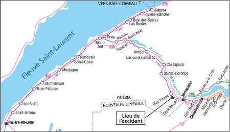 Au point milliaire 23,32 de la subdivision Mont-Joli (voir la figure 1) du Chemin de fer de la Matapédia et du Golfe (CFMG), alors que le train circule vers l'ouest à 42 mi/h, le mécanicien remarque que le train ne répond pas de façon normale. Il serre les freins de service graduellement et arrête le train. À la suite de l'inspection du convoi, le chef de train constate que les cinq dernières voitures ont déraillé (de la 12e à la 16e). Le contrôleur de la circulation ferroviaire (CCF) est informé à 22 h 15 et les voyageurs sont transférés vers l'avant du train. Les voitures déraillées sont alors dételées et le train reprend sa route vers Montréal (Québec).