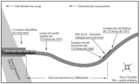 Les roues des voitures ont subi des dommages mineurs. Les dommages occasionnés à la voie commençaient immédiatement au droit des voitures déraillées et s'étendaient dans la courbe jusqu'au coupon de rail Dominion situé sur le rail de la file basse (nord), à environ 3000 pieds à l'est du pont. Le champignon du côté intérieur du coupon de rail était brisé et des fragments s'en étaient détachés. Le coupon de rail, d'une longueur de 27 pieds, était constitué de rail de 115 livres. Il avait été fabriqué en 1958, mais sa provenance et sa date de pose sont inconnues. À l'ouest, il était soudé par étincelage au restant du rail de la courbe, constitué de longs rails soudés (LRS) RE Sydney de 115 livres datant de 1975. À l'est, il était boulonné à un autre coupon de rail de type Sydney de 1975 qui avait été mis en place à la suite de la détection d'une fissure verticale du champignon (FVC) de 26 pouces de long lors de l'auscultation des rails le 10 avril 2007 (voir la figure 2). L'écartement des rails à 30 pieds à l'est était de 57 pouces ¼, à l'intérieur des limites permises selon le Règlement sur la sécurité de la voie (RSV) approuvé par Transports Canada.