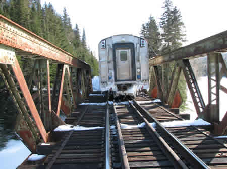 La température ambiante est de -3°C. Le sol est couvert de neige damée et seul le dessus du rail demeure visible. Les voitures déraillées s'immobilisent sur la plate-forme de la voie, à l'entrée est du pont long de 440 pieds qui enjambe la rivière Matapédia. Elles restent debout et attelées à la partie avant du train (voir la photo 1).