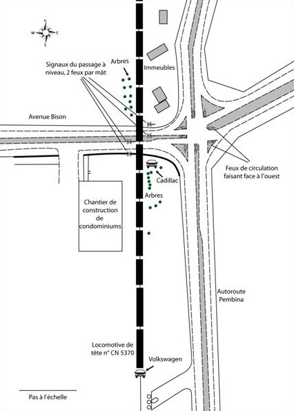 Le passage à niveau est adjacent à l'autoroute Pembina, et se trouve à environ 40 mètres à l'ouest de celle-ci (voir la figure 1). L'autoroute Pembina est la principale voie de circulation qui traverse la ville de Winnipeg du nord vers le sud. Pour les automobilistes qui roulent vers l'est sur l'avenue Bison, les feux de circulation de l'autoroute Pembina sont visibles avant qu'ils ne s'engagent sur le passage à niveau (voir la photo 2).