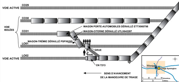 Le 21 octobre 2008 vers 14 hNote de bas de page 1, un déraillement de trois wagons se produit sur les voies du triage Symington du Canadien National (CN), situé à Winnipeg (Manitoba), près du centre de la voie de triage à butte qui occupe la liaison entre les voies LO01 et CO31 (voir la figure 1).