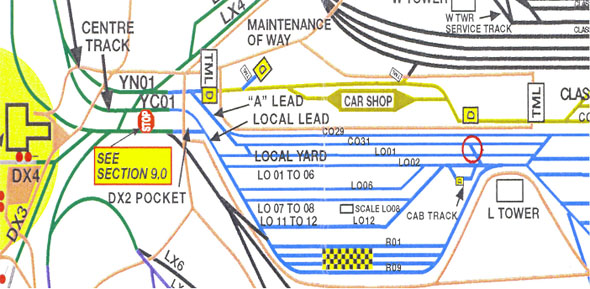 La voie R09 va de la voie LO02, un peu à l'est du secteur du déraillement, et elle pouvait servir d'itinéraire de rechange pour les opérations de triage. Durant les opérations de relevage, on a isolé les voies CO30, CO31 et LO01, mais pas les voies LO02, CO29, CO30 et R09.