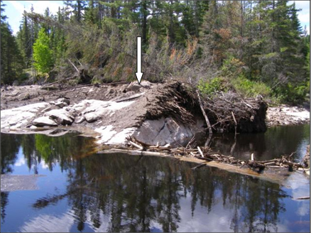 Un ruisseau à proximité s'écoulait par un ponceau posé dans la plate-forme de la voie. Il n'y avait aucun débris dans le ponceau et l'eau s'écoulait librement. Un étang s'était formé en bordure du côté amont de la couche supérieure de la plate-forme de la voie. Des marques laissées par l'eau ont été observés sur le ballast, les traverses et les rails à environ 10 pieds au-dessus du niveau de l'eau observé après l'accident. Il a été déterminé que le haut niveau de l'eau était dû à la rupture catastrophique de trois digues de castor, dont la plus éloignée se trouvait à 1,6 km en amont de la voie; les digues n'étaient pas visibles de l'emprise du chemin de fer de l'OVR. Une partie importante d'une des digues, d'une longueur d'environ 15 pieds, avait été délogée de son emplacement sur du roc lisse (voir la photo 4).