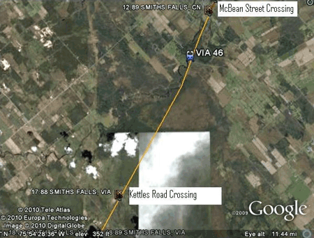 La subdivision Smiths Falls appartient à VIA. La voie principale est simple entre le point milliaire 0,0, à Federal (Ottawa), et le point milliaire 34,5, à Smith Falls East. Dans le secteur où l'événement s'est produit, la circulation ferroviaire est régie par le système de régulation de l'occupation de la voie (ROV), en vertu du Règlement d'exploitation ferroviaire du Canada (REF), et est surveillée par un CCF de RailTerm, posté à Dorval (Québec). La vitesse autorisée par l'indicateur dans le secteur de l'événement était de 95 mi/h pour les trains de voyageurs. De 8 à 10 trains de voyageurs passent dans la subdivision chaque jour.