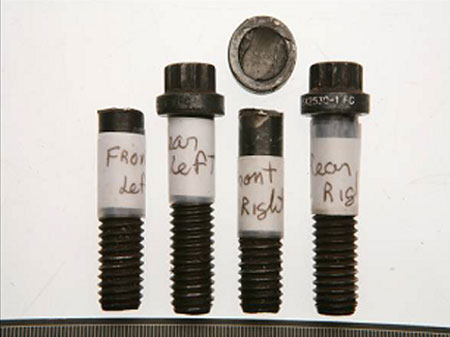 - La progression des fissures de fatigue a suivi différentes directions entrecroisées, surtout dans le cas du boulon de montage avant droit (voir la photo 2).