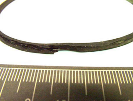 - Une portion du joint torique de caoutchouc s'était coincée entre la base de la pompe et celle du cylindre. On a relevé des éraflures et des petites coupures le long de la surface extérieure du joint étanche, et notamment une déchirure longitudinale de 15 mm et une portion manquante de 10 mm.