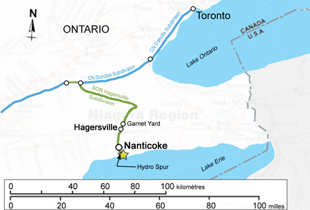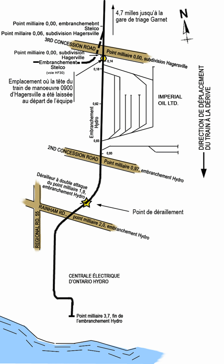 La subdivision Hagersville de la SOR va de Nanticoke (point milliaire 0,0) à Simpson (point milliaire 35,0). Les déplacements ferroviaires de cette subdivision sont régis par la régulation de l'occupation de la voie du Règlement d'exploitation ferroviaire du Canada (REF) et supervisés par un contrôleur de la circulation ferroviaire à North Bay, en Ontario. La vitesse maximale autorisée sur cette voie est de 30 mi/h. Au moment de l'accident, 2 trains environ étaient quotidiennement en service dans cette subdivision. L'embranchement Hydro (point milliaire 0,0) se prolonge au sud de la subdivision Hagersville jusqu'au lac Érié, selon une pente de 1 %. Une raffinerie d'Imperial Oil est située à l'est, immédiatement au sud du point milliaire 0,0 et une installation d'Ontario Hydro est située à l'extrémité sud de l'embranchement (point milliaire 3,17). La circulation des trains sur l'embranchement est régie par la section 105 du REF, et la limite de vitesse maximale est de 10 mi/h.
