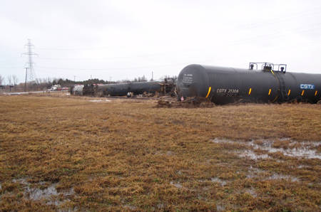Les 9 derniers wagons du train (du 35e au 43e) ont déraillé au dérailleur à double attaque situé au point milliaire 1,9 de l'embranchement Hydro, à environ 100 pieds au nord de Rainham Road (voir la photo 1). Les wagons qui ont déraillé se sont immobilisés dans diverses positions. Sur les 9 wagons-citernes HAZMAT qui ont déraillé, 7 contenaient de l'essence (UN 1203) et 2 du carburant diesel (UN 1202). Trois wagons-citernes chargés d'essence, les wagons 38, 40 et 42, respectivement, ont été endommagés et ont laissé échapper des produits.