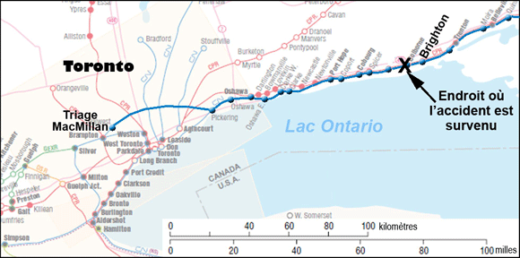 Le train s'immobilise au point milliaire 247,20, près de Brighton (Ontario) (voir la figure 1). L'équipe applique les procédures d'urgence nécessaires et détermine que six wagons, du 98e au 103e, ont déraillé. Au nombre des wagons déraillés, il y a trois wagons-citernes de marchandises dangereuses (les 98e, 102e et 103e wagons) chargés de naphtalène en fusion (ONU 2304), dont un est renversé sur le côté. Il n'y a pas eu de déversement de produit et personne n'a été blessé.