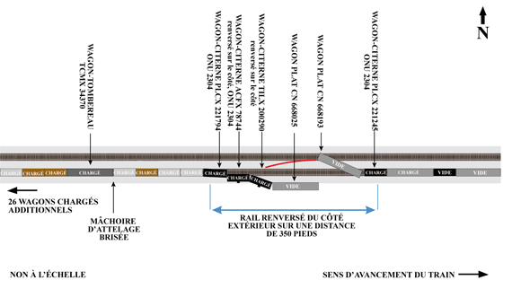 Des mâchoires d'attelage brisées et des axes d'attelage d'événements ferroviaires antérieurs ont été retrouvés de part et d'autre de l'emprise. L'inspection de la voie a révélé que des crampons avaient été soit arrachés, soit cisaillés. D'ouest en est, du 103e wagon au 98e wagon, les deux rails avaient été renversés vers l'extérieur (sur une distance d'environ 350 pieds). À l'endroit où le renversement des rails débutait, on a relevé des marques d'impact de roues sur les traverses, à environ six pouces vers l'intérieur, du côté intérieur du rail nord.