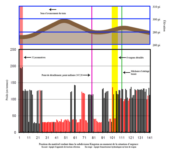 L'analyse au moyen du logiciel TOES a permis de déterminer que les forces maximales de compression des attelages ont été de 1895 kips dans le train en cause dans l'événement. Si l'on avait repris la composition du train en plaçant en tête du train le bloc de wagons chargés (du 108e wagon au 137e wagon) qui avait été placé à la queue du train, une séparation du train entre le 107e wagon et le 108e wagon n'aurait pas fait en sorte que les deux portions du train reviennent en contact l'une contre l'autre. Dans ce scénario, on a aussi déterminé que les forces maximales de compression des attelages ont été de 219 kips. Si l'on avait refait la composition du train, en plaçant en tête du train le bloc de wagons chargés qui avait été placé en queue de train, la force maximale de compression des attelages aurait diminué d'environ 88 %.