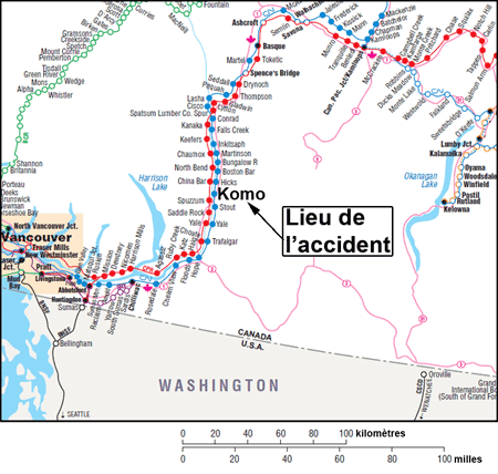 L'équipe du train du CN, un mécanicien et un chef de train, prend le contrôle du train à Boston Bar. Les deux équipiers sont en bonne forme et reposés, conformément aux normes, et ils connaissent bien la subdivision Yale. En quittant Boston Bar, le train se met en route vers l'ouest sous un signal de vitesse normale, sans incident. Le signal d'approche à Komo au point milliaire 7,7 est aussi un signal de vitesse normale. Alors que le train sort d'une courbe à gauche de 6 ° au point milliaire 7,85 et entre dans une courbe à droite de 6 ° 30 min, le phare de sa locomotive révèle sur la voie la présence d'un éboulis de roches, de boue et d'arbres de quelque 150 pieds de long et 10 pieds de haut. L'équipe déclenche un freinage d'urgence à 3 h 24 min 26 s; la vitesse du train est de 22,2 mi/h et la manette des gaz se trouve à la position de ralenti. Le convoi entre en collision avec l'éboulis, roule dessus et en émerge à l'autre bout, où la locomotive se renverse sur le côté, s'immobilisant à 3 h 24 min 39 s, à quelque 30 pieds du bord du talus (photo 1). Les trois premiers wagons derrière la locomotive sont en portefeuille et ont déraillé sans se renverser. Aucun produit n'a été perdu, mais environ 833 gallons de carburant se sont échappés de la locomotive.
