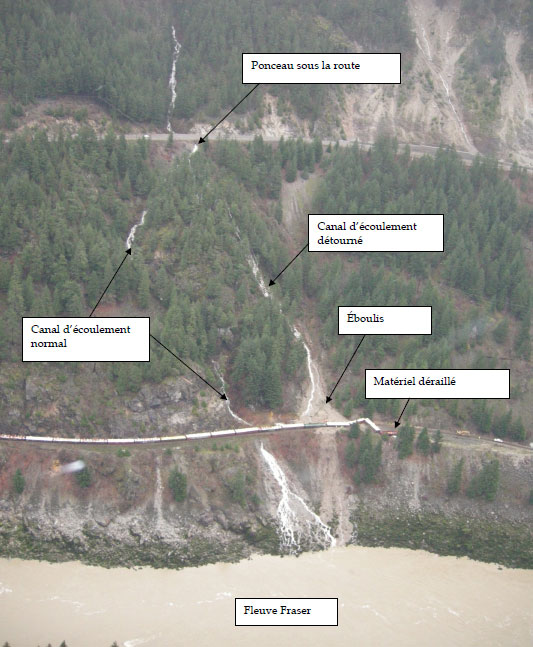Le train a déraillé quand il est entré en collision avec un éboulis de roches, de boue et d'arbres recouvrant la voie ferrée. Le glissement s'est produit pendant une période de pluie abondante quand un grand volume d'eau de ruissellement s'est écoulé par un ponceau routier au-dessus de la voie ferrée; cette eau a débordé de son canal d'écoulement normal pour se déverser partiellement dans un nouveau canal, entraînant ainsi avec elle des débris de roches, de boue et d'arbres de haut en bas de la pente menant à la voie ferrée en contrebas. Les roches disposées le long du canal d'écoulement sous le ponceau routier n'ont pas été suffisantes pour que l'eau s'écoule en totalité le long de la voie de drainage établie en direction de la voie ferrée. Le ponceau routier a fonctionné comme prévu; il n'était pas obstrué et l'eau s'y écoulait sans endommager la route.