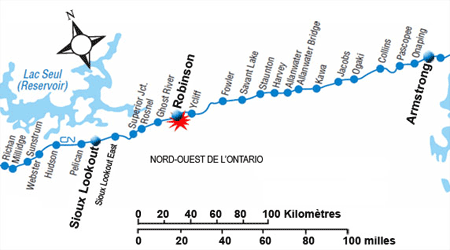 Le 13 février 2009, le train roule en direction est sur dans la subdivision Allanwater. Les membres de l'équipe du train, composée d'un mécanicien et d'un chef de train, ont les qualifications voulues pour occuper leurs postes et ils connaissent bien le territoire. Vers 4 h 35Note de bas de page 1, tandis que le train roule à environ 40 mi/h sur la voie principale, les deux locomotives et 29 wagons placés en tête du train déraillent un peu après l'aiguillage de voie d'évitement est, à Robinson (Ontario) (voir la figure 1). Ni l'équipe du train ni l'équipe des deux trains qui sont passés auparavant au cours de la journée ne remarquent quoi que ce soit d'inhabituel en passant sur l'aiguillage est de Robinson. Toutefois, cet endroit est connu des équipes de trains pour être un secteur cahoteux.