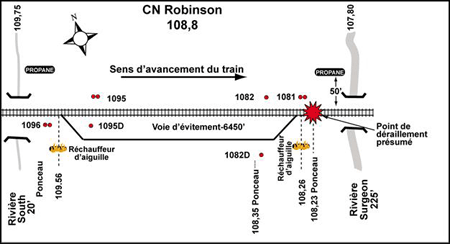 En raison des dommages considérables dus aux efforts de lutte contre l'incendie et de remise en état de la voie, les enquêteurs n'ont pas été en mesure de déterminer avec exactitude le point de déraillement. Cependant, les cinq vérifications de l'état géométrique qui ont été faites en 2008 avaient toutes signalé un certain nombre d'anomalies de la géométrie de la voie dans un secteur où il y avait plusieurs joints de rail, où un ponceau était manquant et où l'on savait qu'il y avait un bourbier. Cela suggère qu'une zone d'instabilité persistante avoisinait le lieu de l'accident. Compte tenu des observations faites, il est vraisemblable que le train a déraillé un peu à l'est de l'aiguillage est de Robinson, quand il a roulé sur le bourbier et sur la plate-forme en mauvais état, ou quand le rail s'est rompu de manière catastrophique.