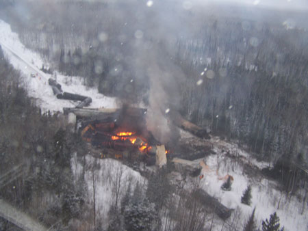 Un réservoir de propane de 800 gallons, qui alimente le réchauffeur d'aiguilles de l'aiguillage est de Robinson, se trouve sur l'emprise à environ 50 pieds au nord de l'aiguillage (voir la figure 2). Pendant le déraillement, le matériel roulant heurte et perce le réservoir, causant une explosion et un incendie. Le feu embrase la plus grande partie du secteur du déraillement, et incendie notamment une quinzaine des 29 wagons déraillés. Deux wagons-citernes chargés de saindoux et un wagon chargé de bois d'œuvre brûlent (voir la photo 1 ). On fait venir sur les lieux de l'accident plusieurs bouldozeurs et des grosses pelles rétrocaveuses, dont on se servira pour circonscrire l'incendie et remettre la voie en état. On utilise l'équipement lourd pour séparer le matériel roulant endommagé et pour le recouvrir de neige, afin d'essayer d'éteindre l'incendie, lequel brûle pendant 24 heures environ. Après avoir circonscrit l'incendie, on continue de déblayer les lieux et de les remettre en état.
