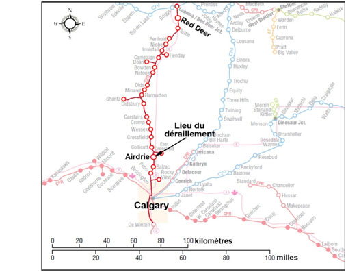 Le train de marchandises no 2-269-02 (le train) du Chemin de fer Canadien Pacifique (CFCP) comprend 2 locomotives General Electric AC 4400, 82 wagons chargés et 19 wagons vides. Il pèse 10 786 tonnes et mesure 6 311 pieds de longueur. On a relevé aucune irrégularité ou problème susceptible d'affecter le train entre Red Deer et Airdrie (voir la figure 1).