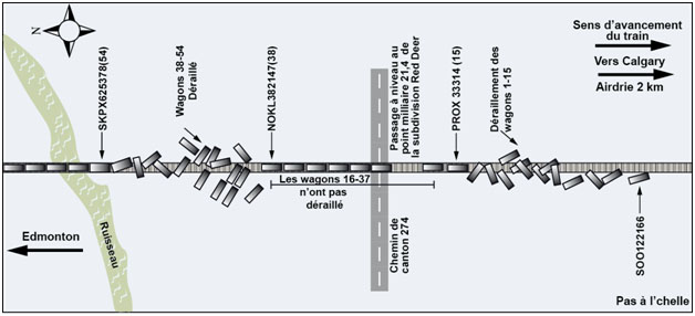 Après avoir diffusé le message d'urgence nécessaire et avisé le contrôleur de la circulation ferroviaire (CCF), le chef de train inspecte le train et constate que 15 wagons, du 1er au 15e, ont déraillé à l'arrière des locomotives. L'équipage, sachant que des wagons de marchandises dangereuses ont été placés près de la tête du train (c.-à-d. que 27 des 30 premiers wagons transportent de l'ammoniac anhydre, UN 1005 Note de bas de page 3), déplace les locomotives en direction sud à un endroit sécuritaire. Une autre inspection révèle que 17 autres wagons, soit du 38e au 54e, ont quitté la voie vers le milieu du train près du point milliaire 21,7 (voir la figure 2). Personne n'a été blessé et il n'y a pas eu de déversement de marchandises dangereuses ni fuite de produit.