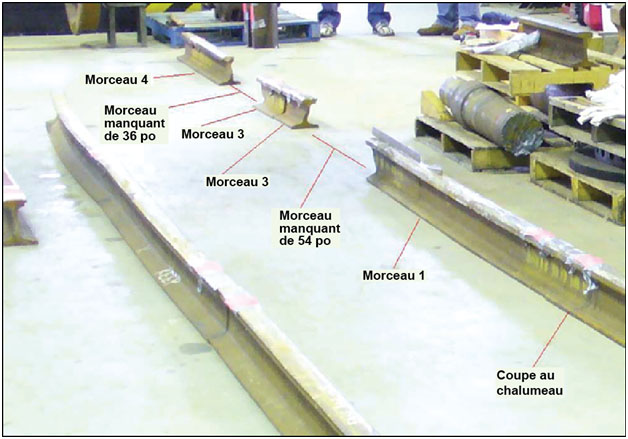 Au total, l'analyse du bris a porté sur 825 pouces (68 pieds et 9 pouces) de rail (soit 358 pouces du rail est et 467 pouces du rail ouest). Les 2 rails comportaient une usure verticale et une usure des surfaces d'écartement d'environ 3⁄32 de pouce et de 5⁄16 de pouce respectivement. L'usure des rails est en deçà de la limite d'usure de la ligne A pour 1 rail de 115 lb (règles du Livre rouge du CFCP sur les exigences relatives à la voie daté du 15 mai 2010, article 17).