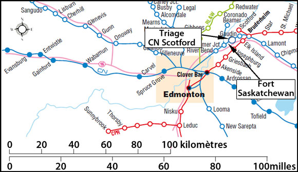 Tôt le matin du 18 août 2010, la manœuvre de triage L602–23–17 (manœuvre 602) du Canadien National (CN) effectue des manœuvres de routine sur la voie d'accès ouest du triage Scotford, à l'est de Fort Saskatchewan (Alberta) (voir la figure 1). Le système de commande de locomotivesNote de bas de page 1 n'est pas utilisé dans ce triage.