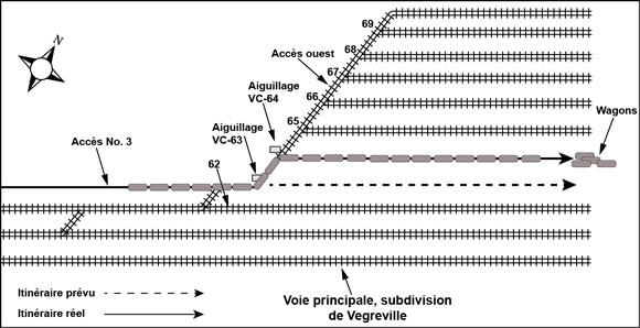 - La collision et le déraillement se sont produits lorsque 55 wagons ont été poussés, sans protection, sur la voie VC-64 où ils ont heurté un groupe de wagons immobilisés. L'équipe avait pour intention de pousser les wagons sur la voie VC-63 puisqu'elle savait que cette voie était libre.