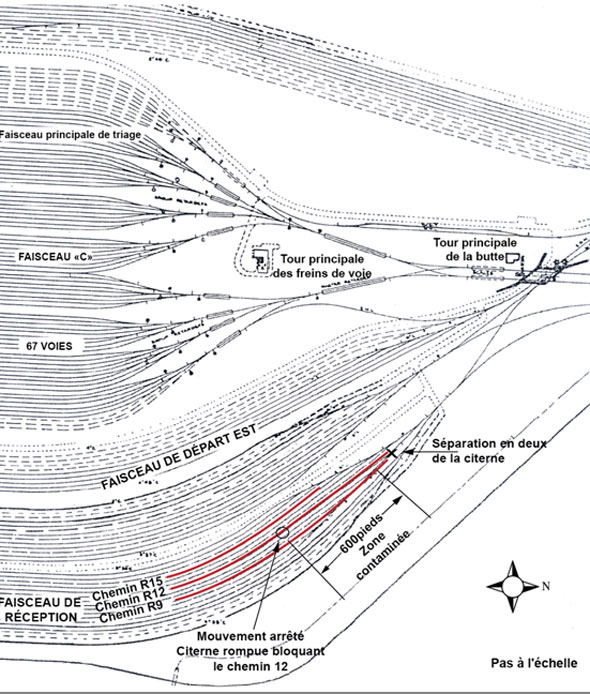 Vers 5 h 45, l'opérateur, qui se trouvait au sol, a attelé la manœuvre à 87 wagons (51 chargés et 36 vides) sur la voie R-011. La totalité de la rame faisait 6042 pieds de long et pesait 6677 tonnes. Après l'attelage, l'opérateur s'est posté à la base de l'escalier menant à la tour de triage de la butte. Selon le plan, il s'agissait de tirer les wagons vers le nord, au-delà de la tour sur la voie de refoulement est, puis d'aiguiller la rame vers la voie de butte en préparation au passage sur la butte. Comme les wagons devaient passer à la butte, leurs freins à air n'étaient pas en service. Le freinage du mouvement n'était assuré que par le groupe de traction de butte.
