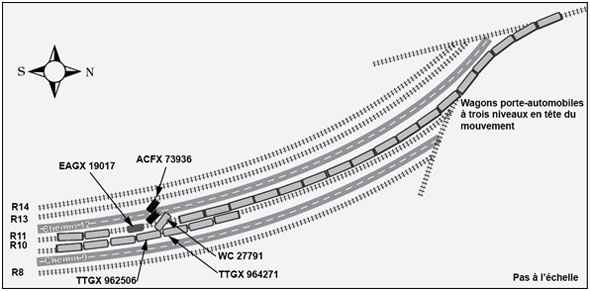 L'opérateur a réalimenté le circuit de frein à air de la locomotive et, à 5 h 49 min 22 s, a recommencé à tirer vers le nord. À 5 h 49 min 58 s, environ 100 pieds plus loin, une autre erreur de transpondeur s'est produit et la manœuvre s'est immobilisée. Comme elle n'était plus en mesure de tirer, le chef de triage a demandé à l'opérateur de refouler à nouveau la rame dans la voie R-011. L'opérateur a changé la direction sur l'unité de commande et, à 5 h 52 min 6 s, la manœuvre a commencé à refouler les wagons vers le sud. À 5 h 54 min 41 s, alors que la rame avançait à 4 mi/h, une nouvelle erreur de transpondeur a déclenché un troisième serrage à fond du frein automatique. À 5 h 54 min 56 s, après s'être déplacée vers le sud sur une distance totale d'environ 600 pieds, la manœuvre s'est arrêtée et le chef de triage a informé l'opérateur qu'elle avait déraillé (figure 2). Il n'y a pas eu de blessés.