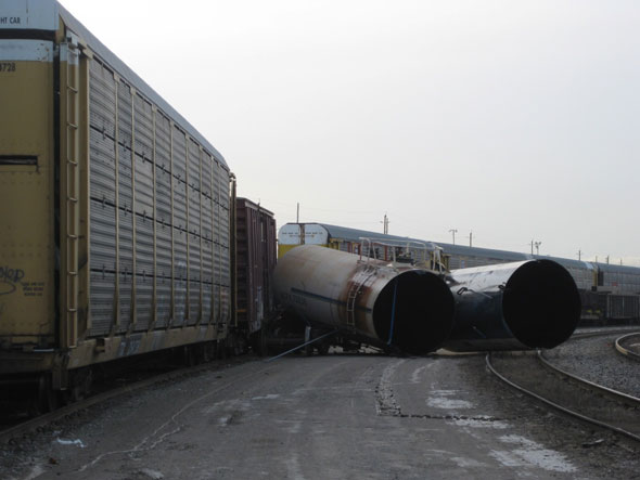- Le déraillement s'est produit quand le wagon-citerne non pressurisé ACFX 73936 pour marchandises dangereuses, qui était chargé de sulfate ferreux, a subi une défaillance catastrophique près de son milieu et s'est rompu en deux parties près de l'aiguillage nord de la voie. Par la suite, le wagon a déversé son contenu le long du chemin 12 et de voies adjacentes.
