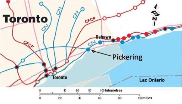 Vers 15 h, heure avancée de l'Est, le 30 mars 2010, 4 locomotives et 11 wagons du train de marchandises M37631-30 du Canadien National ont déraillé près de la gare ferroviaire du Réseau GO au point milliaire 1,40 de la subdivision York du Canadien National à Pickering (Ontario); le train, parti de Toronto, faisait route vers l'est à destination de Montréal. Le réservoir de carburant de l'une des locomotives s'est perforé, déversant environ 50 litres de carburant diesel qui ont pris feu. L'incendie a été rapidement maîtrisé par le service local d'incendie. Aucune marchandise dangereuse n'était en cause et personne n'a été blessé.