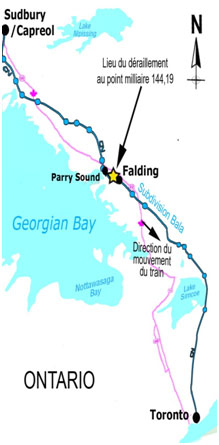 Le 1er octobre 2010, vers 10h 50, heure avancée de l'Est, 21 wagons du train de marchandises no M31451-28 du Canadien National, qui roulait en direction sud de Capreol à Toronto, en Ontario, ont déraillé au sud du passage à niveau du chemin James Bay Junction au point milliaire 144,19 de la subdivision Bala, près de Falding (Ontario). Au nombre des wagons déraillés, il y avait 8 wagons-citernes chargés qui contenaient des gaz de pétrole liquéfiés non odorisés (marchandises dangereuses spéciales, ONU 1075) et 7 wagons-citernes chargés contenant du mazout. Un certain nombre de maisons situées dans le voisinage du déraillement ont été évacuées. Il n'y a eu ni blessures ni déversements.