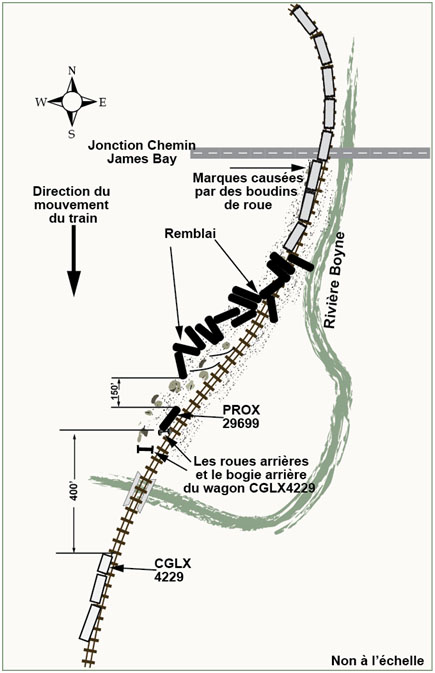 Les 15 wagons-citernes chargés suivants (du 52e au 66e) s'étaient renversés et s'étaient mis en portefeuille selon différentes orientations, surtout vers l'ouest d'une portion de 350 pieds de voie élevée en alignement droit. Dans ce secteur, le rail ouest s'est renversé et s'est déplacé vers l'ouest. Les wagons-citernes déraillés ont glissé dans un talus et se sont immobilisés dans une zone marécageuse, où la voie entrait dans une courbe vers la gauche de 2°. Le 66e wagon s'est immobilisé debout sur la rive de la rivière Boyne, à l'est des voies. Les wagons 67 à 69 ont déraillé debout sur l'âme du rail ouest incliné, et sur les traverses entre les rails (voir la figure 2).