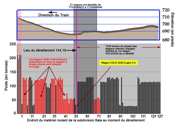 Pour le train en cause dans l'événement, qui compte en tête quatre locomotives ainsi que 24 essieux avec frein rhéostatique en service, une force de compression modérée de 129 kips a produit un rapport effort latéral/effort vertical de la roue de 1,08 au wagon CGLX 4229. Lorsqu'il y a mise en portefeuille de la caisse d'un wagon, les forces exercées sur un wagon sont amplifiées, ce qui crée des situations où une force de compression modérée peut produire un rapport effort latéral/effort vertical élevé. Lorsque les forces agissent sur un wagon léger court, une roue peut être amenée à grimper sur le rail ou à faire se renverser ce dernier.