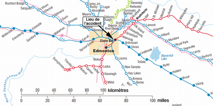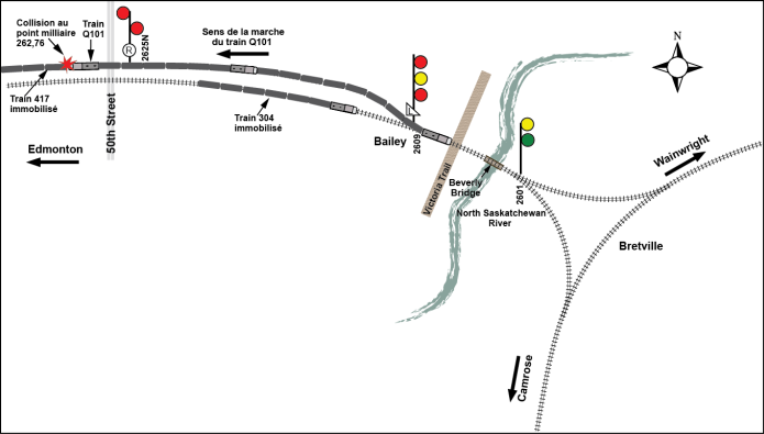 À proximité de l’accident, la subdivision Wainwright est constituée d’une voie principale double commençant au point milliaire 260,9, à l’ouest du pont Beverly. Au moment de l’incident, un troisième train (le train de marchandises 304 du CN, qui se dirigeait vers l’ouest), était arrêté sur la voie principale sud, juste à l’ouest de l’aiguillage de Bailey, attendant que le train Q101 dégage la voie.
