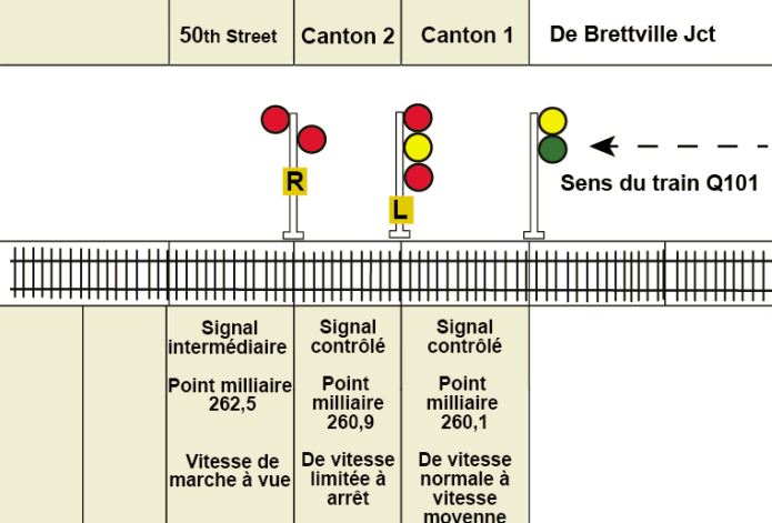 - À 6 h 21:10, le train Q101 a franchi le signal 2601 (point milliaire 260,1) à une vitesse approximative de 30 mi/h, avec la commande des gaz à la position no 7. À cet emplacement, le signal était un signal haut à 2 aspects. Lorsque le train a franchi cet emplacement, le signal indiquait vitesse normale à vitesse moyenne (jaune sur vert) Note de bas de page 2.