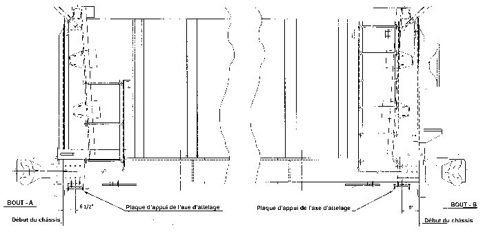 Selon la nouvelle conception, les axes d'attelage sont positionnés différemment à chaque bout des wagons car l'attelage au bout B est un attelage fixe standard tandis que celui du bout A est rotatif, ce qui permet de décharger les wagons en les tournant alors qu'ils sont encore attelés au train. La plaque d'appui de l'axe d'attelage au bout BNote de bas de page 2 doit être placée à 9 pouces de l'extrémité du wagon et celle du bout A, à 6 ½ pouces (Figure 2) pour accommoder les mouvements d'attelage.