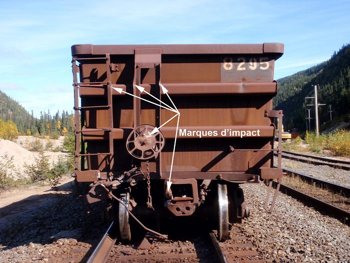 Tout le matériel roulant déraillé a été examiné. La barre d'attelage du 23e wagon (wagon IOCC 8295) s'est détachée et est demeurée attelée au 22e wagon. L'axe d'attelage et le levier de dételage ont été trouvés entre les rails au point milliaire 57,06 et au point milliaire 56,40 respectivement. Des marques d'impact ont été relevées aux extrémités des caisses des 2 wagons ainsi que sur le côté ouest de l'essieu menant et du châssis du 23e wagon (photos 2 et 3).