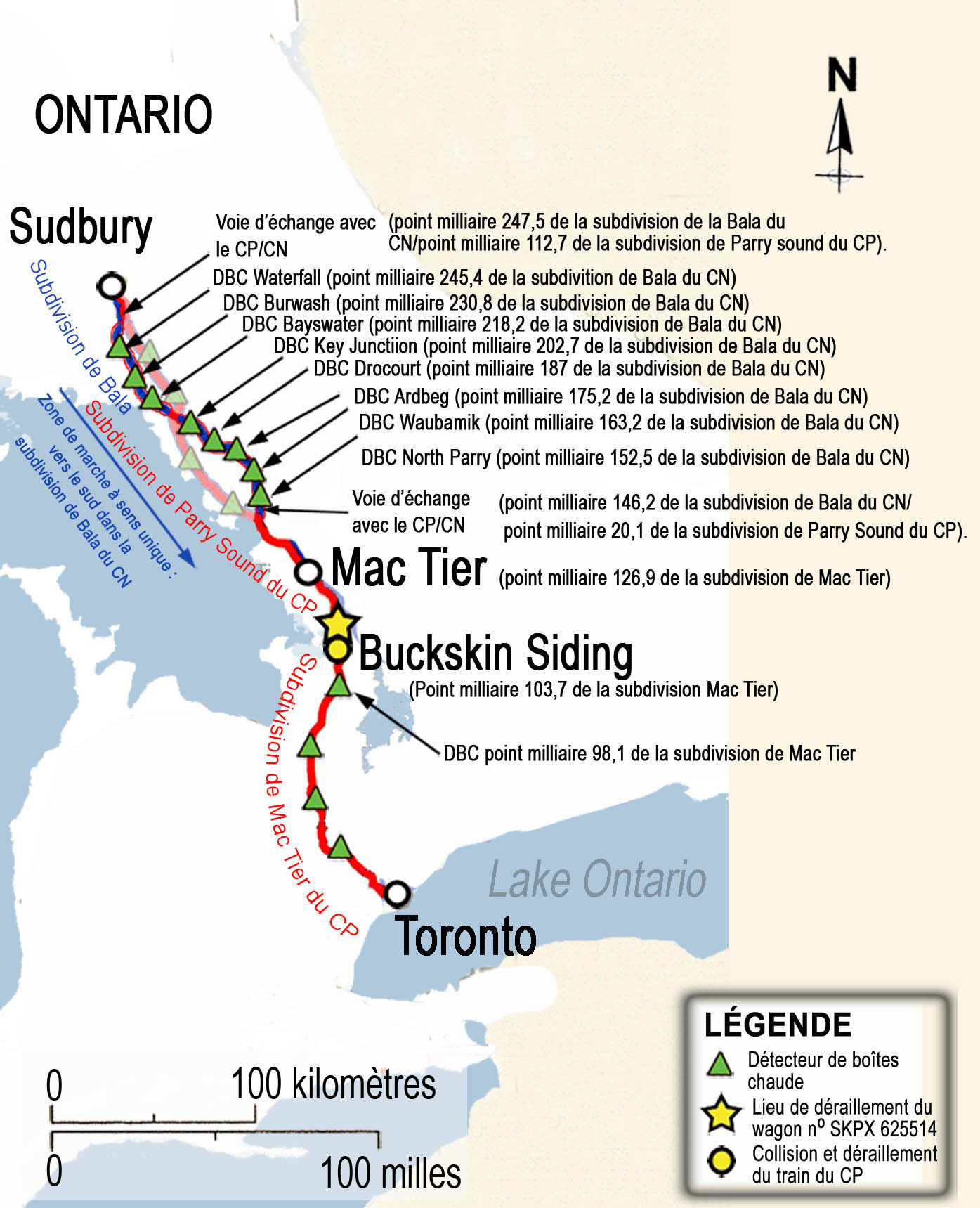 La subdivision de Parry Sound du CP est composée d'une voie principale unique qui s'étend, du nord au sud, de Romford (Ontario), point milliaire 121,7, à MacTier (Ontario), point milliaire 0,0. Le DBC du CP le plus au sud dans la subdivision de Parry Sound se trouve au point milliaire 26,0. La subdivision de MacTier du CP est composée d'une voie principale unique qui s'étend, du nord au sud, de MacTier, point milliaire 126,9 à Osler (Ontario), point milliaire 0,0. Le premier DBC du CP que traversent les trains circulant en direction sud de MacTier se trouve au point milliaire 98,1.