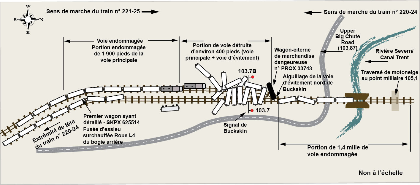 Le 26 janvier 2011, à environ 3 h 10, heure normale de l'Est, un des wagons du train de marchandises no 220-24 du Chemin de fer Canadien Pacifique (CP) qui se déplace en direction sud à une vitesse d'environ 45 mi/h, déraille au point milliaire 105,1 de la subdivision de MacTier du CP, près de Buckskin (Ontario). Le train poursuit sa route jusqu'à l'aiguillage de la voie d'évitement nord de Buckskin, au point milliaire 103,7, où 20 autres wagons déraillent, dont le wagon-citerne de marchandises dangereuses PROX 33743 chargé de gaz de pétrole liquéfié non odorisé (marchandises dangereuses spéciales, ONU 1075). Certains wagons déraillés percutent latéralement le train de marchandises no 221-25 du CP qui est immobilisé sur la voie d'évitement de Buckskin en direction nord. La locomotive de tête de ce dernier déraille, et les 9 premiers wagons ainsi que la deuxième locomotive du train 221 sont endommagés. Par mesure de précaution, 15 familles des environs sont évacuées. Personne n'est blessé et il n'y a aucune perte de marchandise.