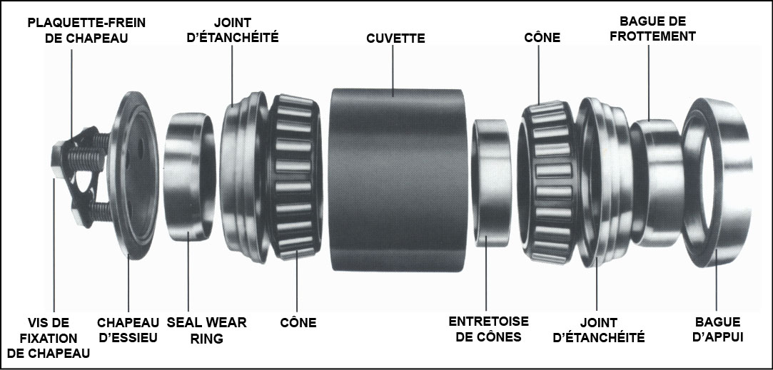 Un roulement à rouleaux se compose d'une cuvette extérieure qui renferme 2 cônes pourvus de rouleaux coniques qui sont séparés l'un de l'autre au moyen d'une entretoise. Chaque train de rouleaux comporte un chemin de roulement, des rouleaux et une cage. Des joints d'étanchéité intérieur et extérieur, des bagues de frottement, une bague d'appui et un chapeau d'essieu complètent le roulement à rouleaux (voir la figure 3). La cuvette, les rouleaux et les cônes sont trempés. En outre, les surfaces qui sont étroitement en contact les unes avec les autres font l'objet d'une opération de finition de précision. La cage joue essentiellement le rôle d'entretoise qui maintient les rouleaux en place à l'intérieur du cône. En ce qui concerne le roulement à rouleaux L4 qui a cédé sur le wagon no SKPX 625514, la cage a été poinçonnée (formée à froid) à partir d'une feuille d'acier malléable à faible teneur en carbone.